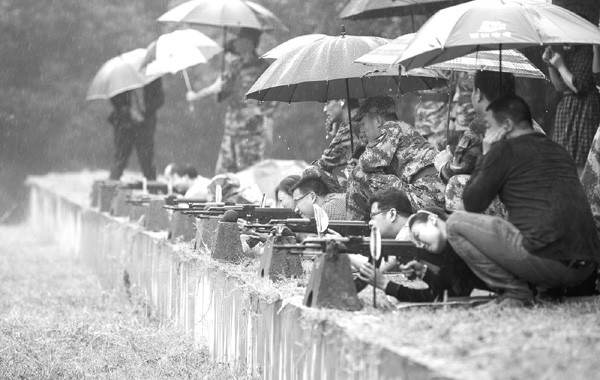 根据在全省宣传文化系统开展国防教育月活动的有关要求,9月24日,市委宣传部组织宣传文化系统干部职工39人参加实弹射击训练。图为参训的干部职工在军分区官兵指导下冒雨实弹射击。 (记者 徐 斌摄)