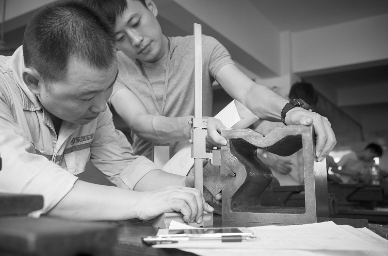 9月28日,2015“万人文体比赛、万人技能比武”活动数控车床、钳工、服装比赛在随州技师学院举行。图为钳工比赛现场,参赛人员在加工零部件。 (记者 徐斌 摄)