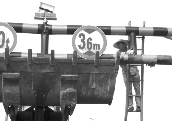 我市路政部门日前对撞损的道路限高设施进行维修,同时呼吁驾驶员要按照规定,文明驾驶。(记者 孙洪涛摄)