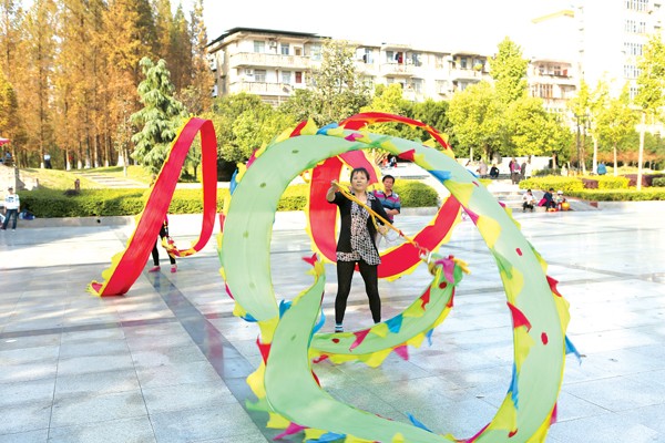 周末的神农公园秋阳艳照,市民们乘兴来此游玩观景。图为市老年大学金龙队表演的布带龙飞快地腾飞舞动,为人们助兴。 (记者 白丁摄)