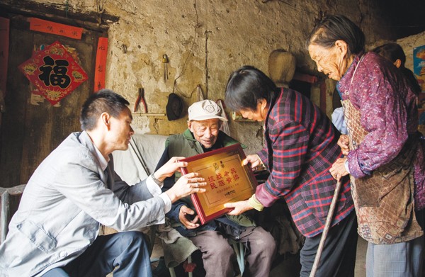 日前,我市关爱老兵志愿者慰问了我市健在的抗战老兵,给他们送去了慰问品、抗战胜利70周年纪念章和慰问金,图为志愿者看望广水市余店镇聂店村的新四军老兵陈怀新。(记者 徐 斌摄)