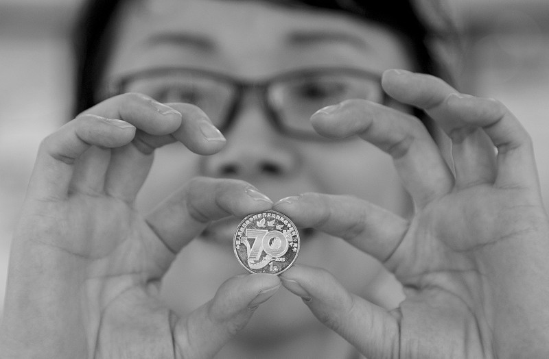 10月12上午,中国人民银行发行的“中国人民抗日战争暨世界反法西斯战争胜利70周年”纪念币开始兑换,纪念币面额一元,收藏流通均可,市民可凭身份证到各大银行指定网点兑换,每人限2枚。图为银行工作人员展示纪念币。 (记者 徐斌摄)
