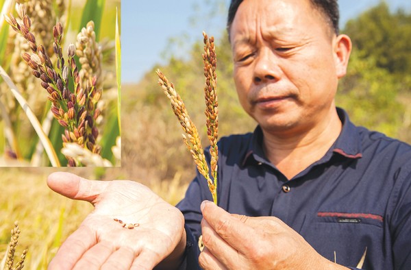 今年,宫保贵在随县高城镇大桥村试种彩色水稻,目前已经成熟,预计亩产可达500公斤。图为10月14日宫保贵向记者展示彩色水稻,该水稻成熟后,稻壳由紫红色变成黄色,米粒为紫褐色。(记者 徐斌 摄)