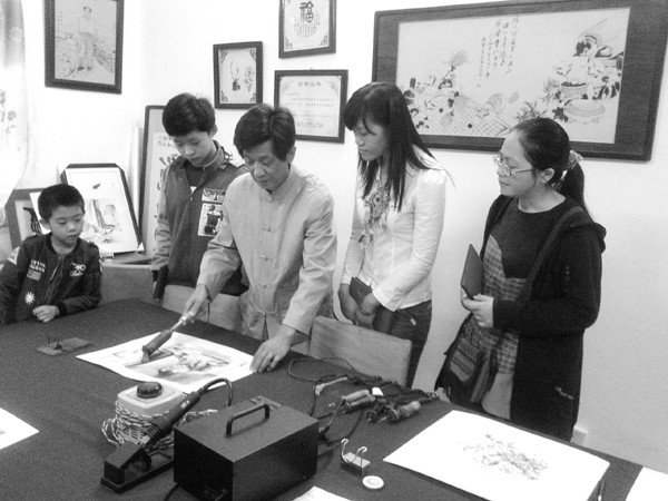 本报讯 记者金鸣、黄闯报道:10月11日,湖北省大师级民间技能传承人、随州市烙画大师汪福安,在他的工作室里举行了收徒仪式。3名烙画爱好者拜过汪福安,接下他手中的聘书,向他敬茶后,正式成为他的徒弟。