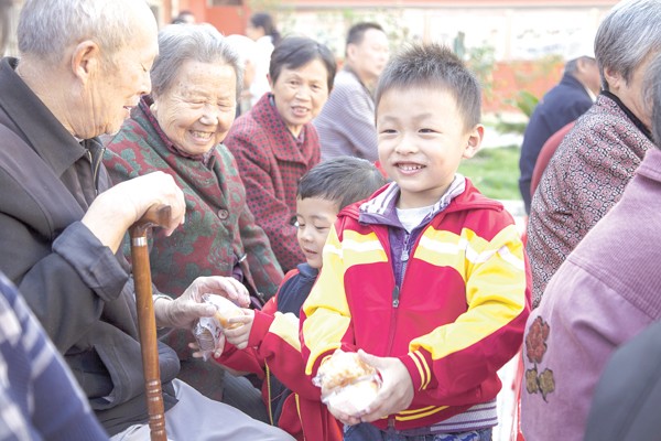 10月21日是九九重阳节,曾都区龙门街社区组织开展庆重阳联欢会,弘扬敬老爱老传统美德。图为社区儿童向老人赠送小食品。 (记者 徐斌摄)