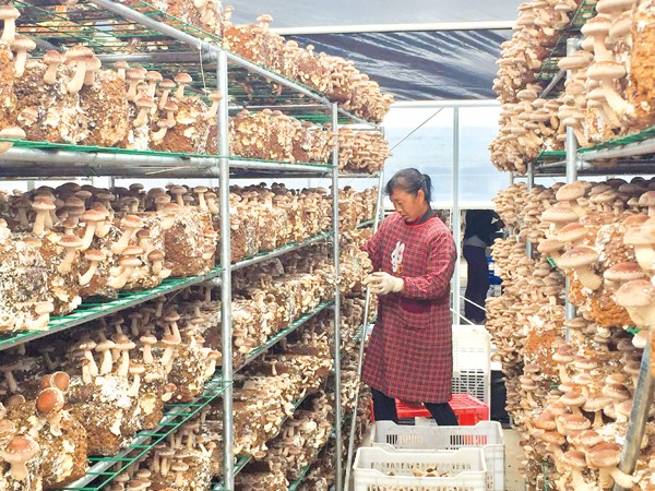 湖北炎帝科技公司今年新建成的数十个智能温控大棚投入使用,这种大棚出菇量大,质量高,污染少,每个棚可出3茬,头茬可出菇16吨。(记者 徐斌摄)