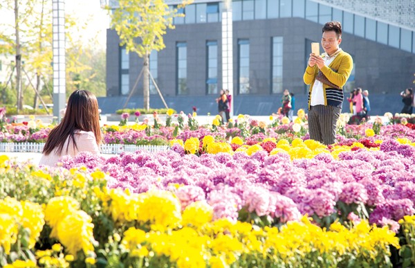 11月2日,规划展览馆广场上的金秋菊展基本布展完毕,吸引过往市民驻足观赏。(记者 徐斌摄)