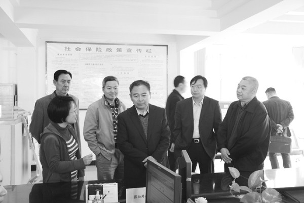 省人社厅督办调研组来随调研,重点督办人社事业发展“十二五”规划任务目标和2015年度人社任务完成情况。图为调研组一行在曾都区人社局服务大厅实地查看窗口服务情况。(申 杰摄)