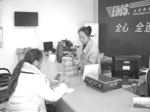 广水邮政局速递物流公司严格遵循实名制登记规定。图为工作人员检验客户身份证的情景。(本报记者 聂忠诚摄)