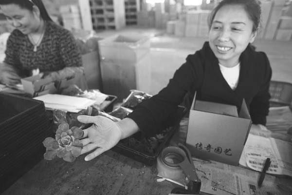 “传奇园艺”于2009年9月在淘宝网注册,以经营多肉植物等为主。目前已成为淘宝网多肉植物主网销量第一的双金冠店铺。图为员工正将多肉植物装箱快递。(记者 孙洪涛摄)