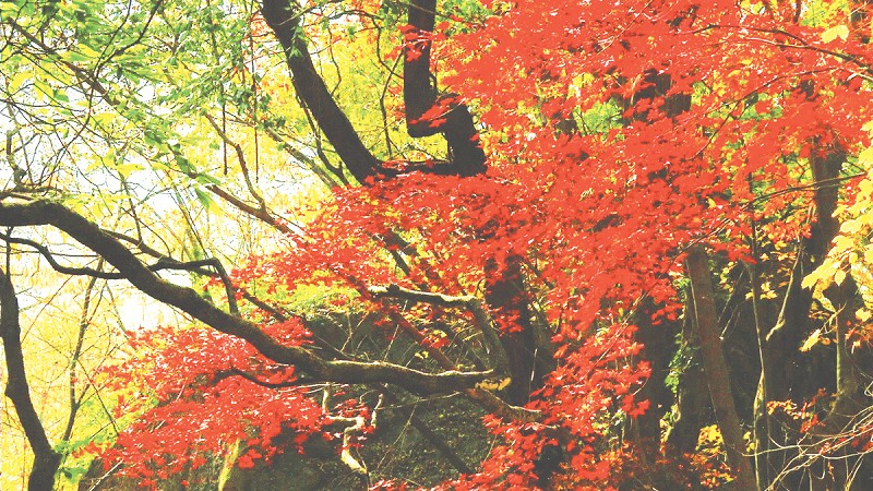 红叶在秋风中摇曳,泼溅出生命的炽烈。红的、黄的、绿的枫叶,片片落在长满绿色苔藓的石头上、潮湿的地上,却依然叶脉分明,体形完整,色彩斑斓。叶色或深红,或淡红,或浸泡雨水之后暗红。叶片自然零落构成的图案,俨然成画,妙趣天成。阳光在叶面慢慢浸润,一个轮回之后,大洪山将迎来无比绚烂的樱花时节。
