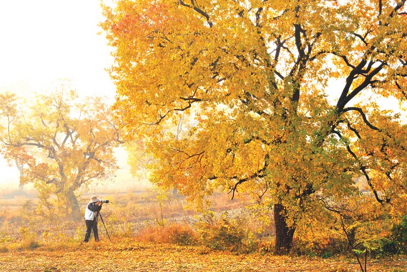 野菊花悄无声息地装饰了地面。千年银杏树下,落叶铺成金黄的地毯,颜值爆表的模特和摄影师,也成了游客眼中的一道亮丽风景。