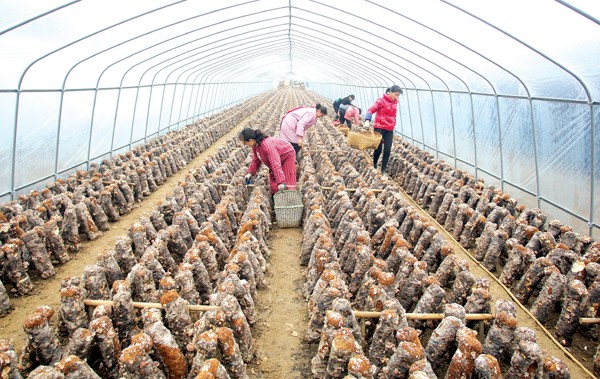 曾都区洛阳镇九口堰村富民蘑菇农民专业合作社,目前已发展“菇——稻”高效轮作标准化示范基地2000亩。图为合作社村民正在采摘蘑菇。 (记者 孙洪涛摄)