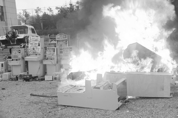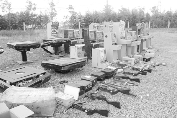 为严厉打击 “赌毒黄”违法犯罪行为,净化社会治安环境,随州市公安局特警支队集中警力,适时进行重点整治。截至目前,共收缴捕鱼机、游戏机、麻将机50余台,毒品150余克,弓弩、管制刀具140余把。图为近日,随州特警正在销毁赌博机及管制刀具。(通讯员 程昆 刘智明摄)