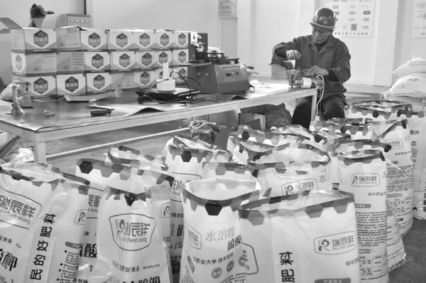 湖北瑞辰祥生态肥业有限公司结合现代农业科技研制生产出微量元素含量较多的系列复合化肥,产品畅销国内市场。图为公司包装车间一角。(记者 陈德友摄)