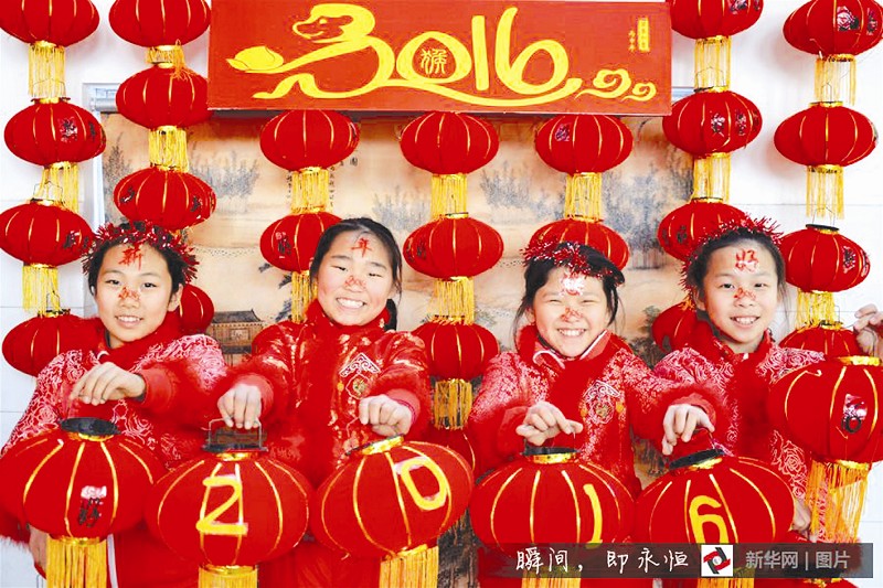 2015年12月31日,小学学生手拿印有“2016”的红灯笼,迎接新年的到来。(赵东山 摄)