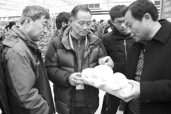 2015年12月12日,中国食用菌协会常务理事、随州市食用菌协会副会长刘毓(右一)在湖北裕国公司向华农大教授吕作舟(左二)请教工厂化栽培猴头菇的有关技术。 (通讯员 石守京摄)