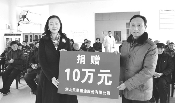 湖北天星粮油股份有限公司日前开展寒冬送温暖活动,该公司为随县光荣院的孤寡老人捐款10万元。(本报记者 孙洪涛 通讯员 龚承斌 肖宏军摄)