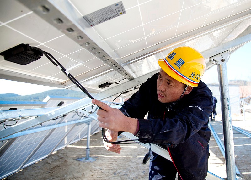 ▲ 韩勇华在连接光伏组件线路