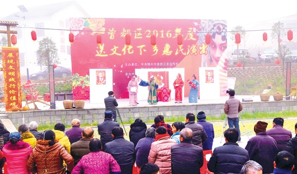 曾都区委宣传部、曾都区文体广电局近日组织随州花鼓剧团开展曾都区2016度送文化下乡惠民演出活动,为广大村民送上一份文化大餐。(记者李文军摄)