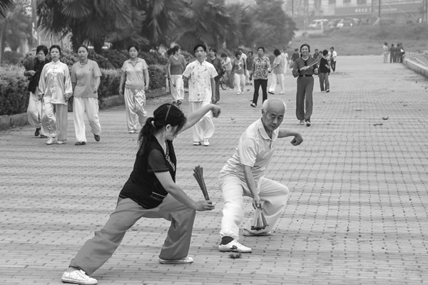 每天早晨随县唐县镇居民聚在河边广场打太极拳、跳健身舞,享受和城里人一样的健康生活,全民健身运动正在该镇悄然兴起。 (记者 李文军 摄)