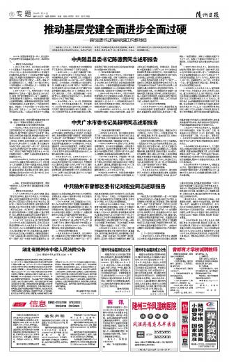 编者按:1月12日,市委召开了县市区委书记抓基层党建工作述职评议会议。这是从严治党新常态下加强基层党建工作的重要举措。根据市委要求,现将各县(市、区)、随州高新区、大洪山风景名胜区党(工