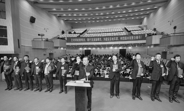市人大三届六次会议上新当选的任职人员手抚宪法面向国旗宣誓任职。 (记者 李文军 摄)