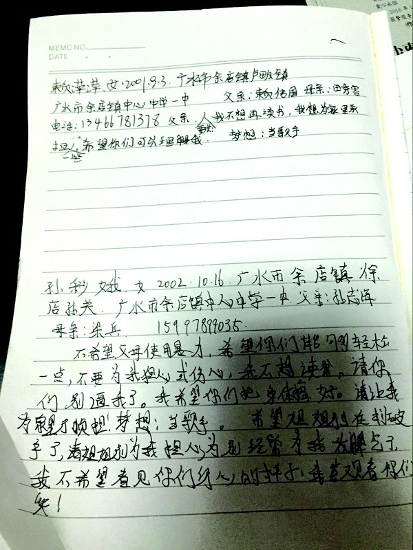 “我不想再读书,我想为家里多分担一些,我的梦想是当歌手,就是想出去闯闯。”“不希望父母使用暴力,希望你们能够轻松一点,不要为我担心或伤心,我不想读书,请你们别逼我了,我希望你们把身体搞好,请让我为家里减轻负担。我的梦想是当歌手,希望姐姐别再划破手了,请姐姐别为我担心,别经常为我发脾气了,我不希望看见你们伤心的样子,我希望看你们笑。”这是两名小女孩写给家人的话。在稚嫩的语言里,依稀可见两名女孩的梦想。