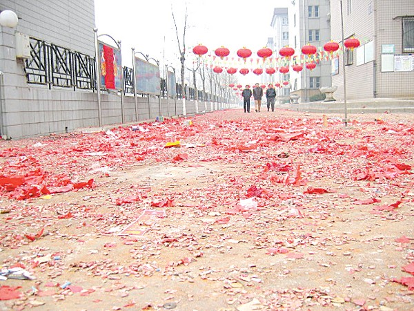 噼噼啪啪的烟花、鞭炮响过之后,一片狼藉(记者 黄闯摄)