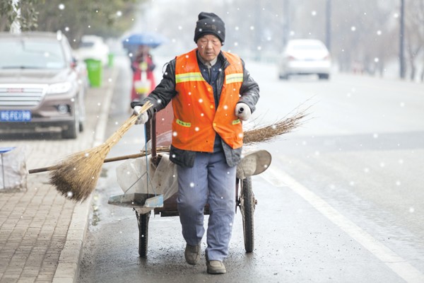 “创卫”风雪无阻。昨天随城飘起了漫天雪花,环卫工人依然坚守在岗位上。 (本报记者 徐 斌摄)