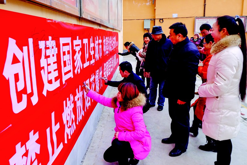1月28日,曾都区西城办事处天后宫社区居民在“创建国家卫生城市”和“禁止燃放烟花爆竹”横幅上签名,支持市政府的倡仪。 (本报记者 李文军摄)