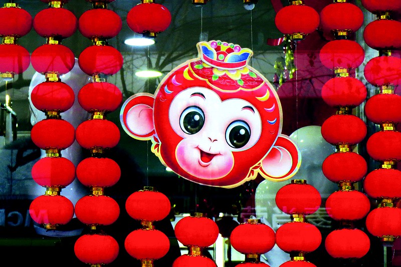 猴年春节临近,商家们将橱窗装扮得喜气洋洋,增添了节日氛围。 (本报记者 孙洪涛摄)