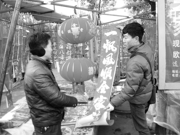 春节马上就到了,当你走上街头,过大年的喜庆气氛处处可见。图为我市返乡过节的大学生利用寒假体验卖春联的场景。(记者 周 强摄)