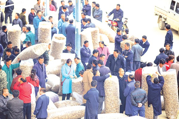 2月13日 (正月初六),随县三里岗镇吉祥寺村香菇大市场新年一开市,就吸引了省内外众多菇商前来交易,场面十分火爆。(记者 李文军摄)