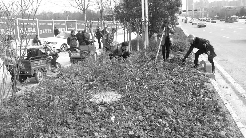 “创卫”过程中,市园林部门打响了绿化带垃圾清理及绿化苗木补植攻坚战。图为园林工人补植道路绿化带中缺损苗木。(记者 冯家园摄)