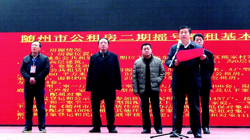 2015年12月21日,我市公租房二期公开摇号配租。1160户住房困难家庭喜获入住资格,摇中率达到80%。曾都区东城办事处天后宫社区的钟先法获得第一个“入住权”。听到自己的名字,他高兴不已:“感谢政府的好政策,解决了我多年住房难题,圆了我的安居梦。”