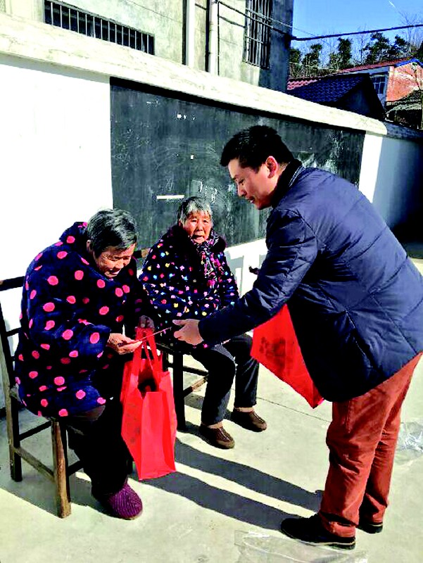 曾都区何店镇乔麦河村外出创业人员方世松、方世颖两兄弟,致富不忘乡邻,2月15日(正月初八),兄弟两人带着对家乡老人深厚的感情,给全村老人拜年,将慰问金和物资送到183位老人家中。 (本报记者 唐天才 通讯员 谢志勇 摄)