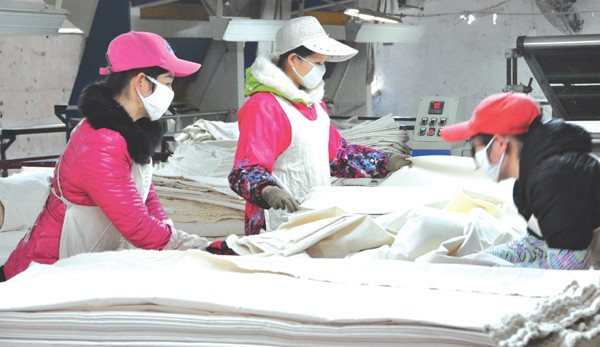 随县厉山镇规模企业日前已全部开工生产,奋战开门红。图为灯耀纺织公司验布车间的女工正认真验布,确保纺织品合格率。 (记者 孙洪涛 通讯员 龚承斌 何波 摄)