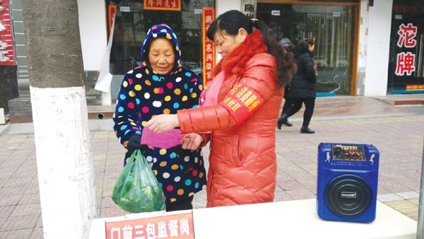 2月14日,曾都区网格员们在各社区内开展禁鞭宣传,并监督、劝阻居民燃放烟花爆竹。 (本报记者 周强 通讯员 蒋君 摄)