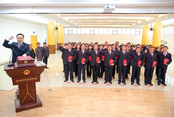 3月1日,市检察院28名首批入员额检察官手握宪法文本面对国徽宣誓。当日,我市司法体制改革后计入员额的90名检察官也举行了宣誓仪式。 (记者 徐斌摄)