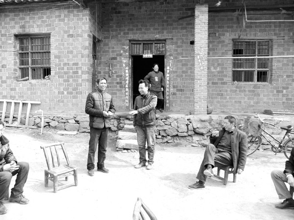 随县殷店镇白庙村三组村民徐明华十分贫困,又不幸患上重症。当地村民自发组织捐款,图为村民代表为徐明华送去5600元现金。(记者 周 强 通讯员 陈 琰摄)