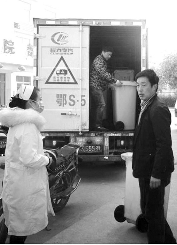 随县万福卫生院高度重视医疗废物的管理,认真贯彻执行医疗废物的各项法律法规,确保医疗废物管理到位。图为门诊注射室护士长与“一片净”专职收集人员交接医疗废物。 (通讯员 李 莉摄)