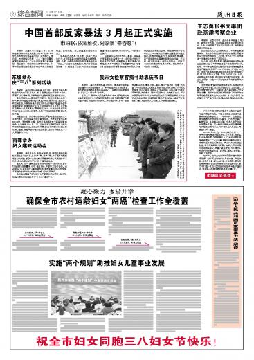 本报讯 记者陈巧玲报道:3月1日,我国首部预防和制止家庭暴力的专门法律 《中华人民共和国反家庭暴力法》正式施行。连日来,市妇联组织开展 “三八”维权周暨反家暴法宣传活动,广泛发放反家暴法