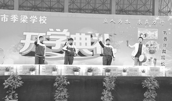 日前,随州季梁学校开学典礼一改常规的学校领导总结工作、致辞、颁奖、代表发言等老模式,变为读书主题队会,以寒假“亲子阅读”为基础,有活动表彰、亲子读书演讲、晨诵展示、群口快板和三句半等读书节目的表演。图为学生表演三句半《做个读书人》。 (通讯员 杨娜 张学斌摄)