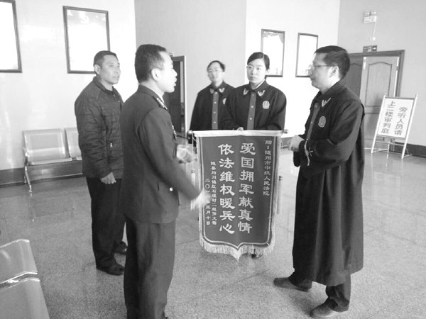 3月9日,随县均川镇红石垭村二组村民魏某和随州军分区、武警随州支队的三名干部将一面写有“爱国拥军献真情,依法维权暖兵心”的锦旗送到随州市中级人民法院,对随州市中级人民法院民一庭法官在办案中依法维护军人家属合法权益的行为表示感谢。 (通讯员 张欢摄)