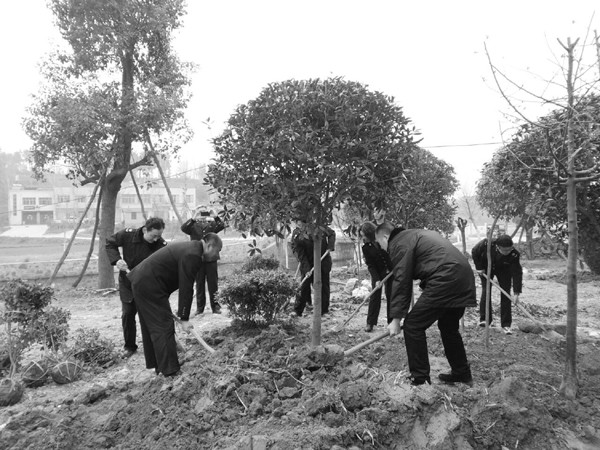 曾都区国税局20多名干部昨日来到精准扶贫联系点——何店镇王店村,植树500余株,绿化村文化广场,同时捐款5万元,用于该村绿化发展。(通讯员 谢红梅 摄)