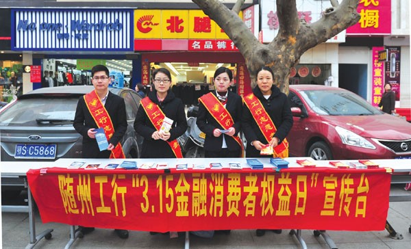 3·15国际消费者权益保护日当天,随州工行在银泰新世纪购物中心门前设立宣传咨询点,向居民发放金融消费者权益宣传单,解答疑惑,切实保护金融消费者的合法权益。 (通讯员 龚萱摄)