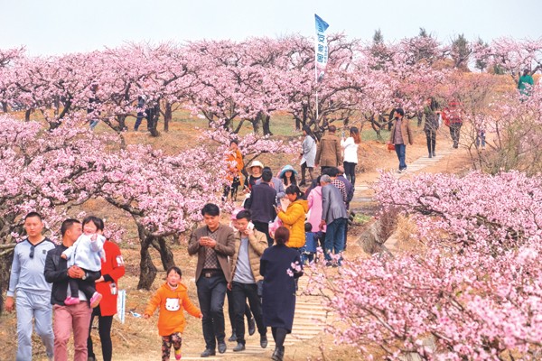 春风暖阳,花海人潮。5万亩桃园花开正艳,位于景区中心地带的群金村繁华如市,游客们踏青赏花、购物娱乐、拍照留念。开幕式现场,民间文艺、特技风筝、古典礼仪、古装穿越等活动好戏连台,引得喝彩阵阵。