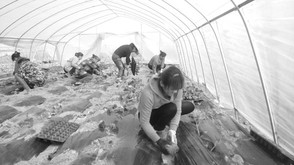 随县吴山镇农壮蔬菜专业合作社在吴山财政所帮助下,新建了100个高标准的温室大棚,目前已成为该镇闽商石材工业园最大的蔬菜供应基地。图为菜农正在栽种黄瓜种苗。(记者 金鸣 通讯员 彭俊摄)