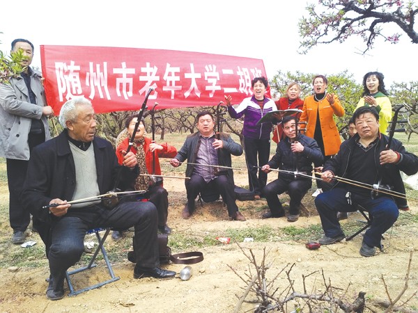 阳春三月,随州市老年大学二胡班的老年朋友,带着二胡来到随县尚市镇群金村油桃林中,他们自娱自乐,享受大自然的美景,别有一番情趣。 (本报记者 金 鸣摄)